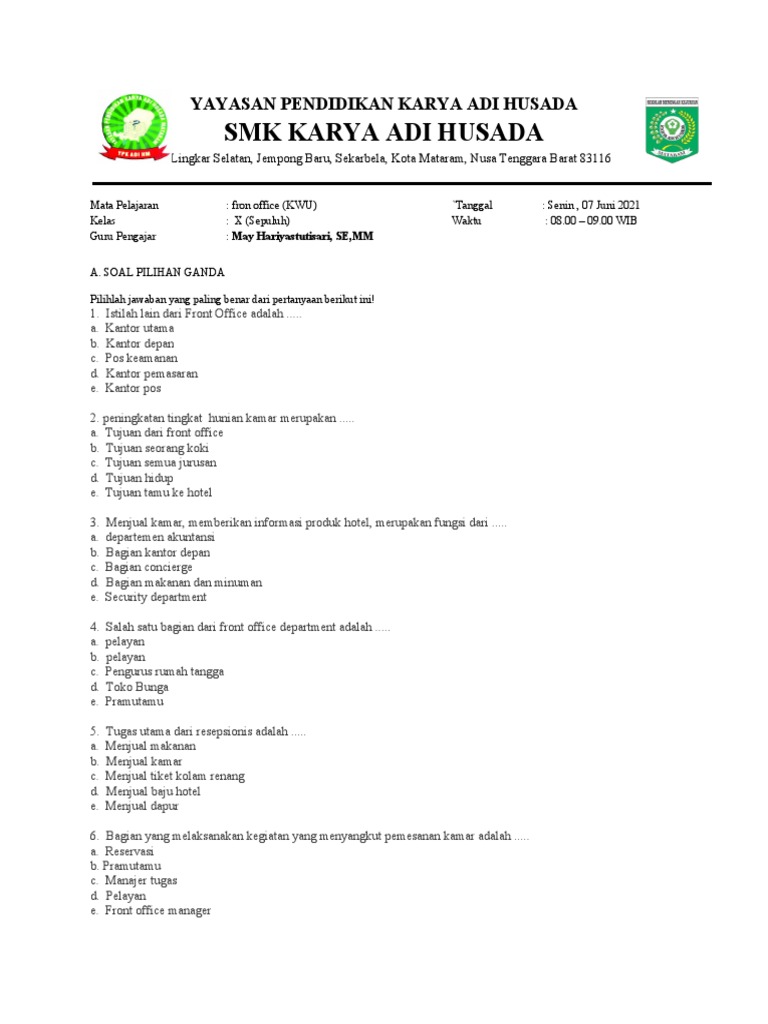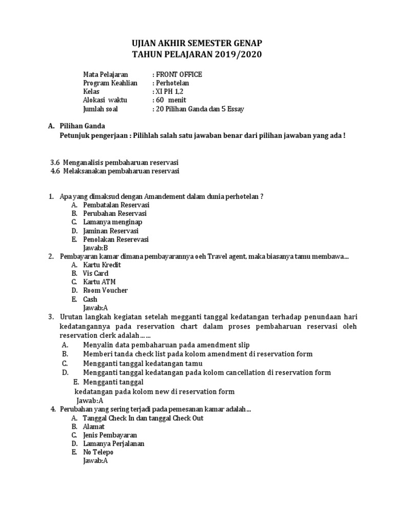 "how long has the u.s. Xii ( duabelas) hari/tanggal : Center which ____ hundreds of americans.". Jul 09, 2020 · contoh soal front office pilihan ganda beserta jawabannya dapatkan contoh. Dec 03, 2020 · inilah soal produktif perhotelan kelas 12 mata pelajaran front office beserta kunci jawaban, soal pilihan ganda front office kelas 12